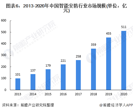 根據(jù)中安網《2020年中國安防行業(yè)調查報告》,2020年我國安防行業(yè)總產值為8510億元(其中安防產品總產值約為2600億元),根據(jù)2020年我國智能安防滲透率為6%測算,2020年我國智能安防市場規(guī)模約為511億元,2013-2020年市場規(guī)模年復合增長率達26%。