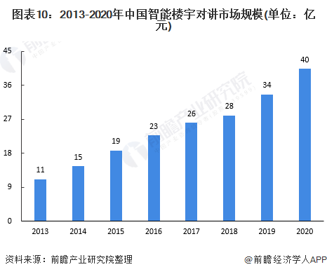 近年來,隨著居民生活水平的提高,居民住宅小區(qū)的管理越來越規(guī)范和嚴謹,居民對于樓宇對講系統(tǒng)的性能要求有所提升,不再局限于簡單的語音對講,而逐年向網絡化、可視化化發(fā)展。數(shù)據(jù)顯示,隨著樓宇對講系統(tǒng)的不斷升級,樓宇對講智能化滲透率不斷提高,目前滲透率在20%左右。2019年中國樓宇對講系統(tǒng)市場規(guī)模為154億元,由此得出2019年中國智能樓宇對講市場規(guī)模約為34億元,2013-2019年復合增長率為20%。據(jù)估算,2020年市場規(guī)模約為40億元左右。