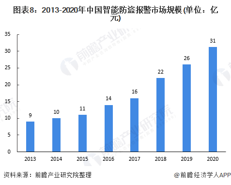 據(jù)中安網數(shù)據(jù)顯示,2020年我國安防行業(yè)總產值8510億元,其中安防產品總產值約為2600億元,結合防盜報警系統(tǒng)產值占安防產品總產值12%左右,根據(jù)我國智能防盜報警系統(tǒng)滲透率在10%左右測算,得出2020年我國智能防盜報警系統(tǒng)產值約為31億元。